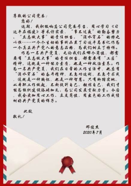滿腔深情寄紙箋!合力泰黨委發(fā)出“我給組織寫封信”活動(dòng)倡議,一個(gè)月時(shí)間,先后收到近百封來自基層一線的黨員信件。大家緊密結(jié)合擔(dān)負(fù)任務(wù)談感想、述忠誠、作承諾,寫下發(fā)揮先鋒作用的決心,和實(shí)現(xiàn)崗位建功的信心。