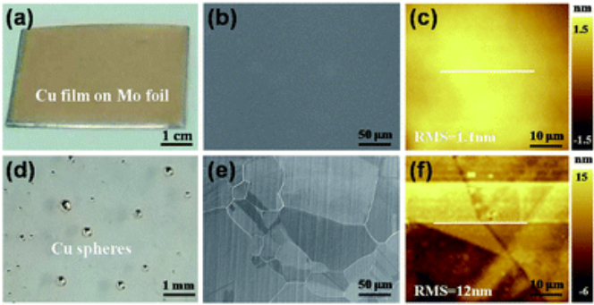 2基板上Cu球的照片。(e,f)多晶Cu箔在1070℃退火后的SEM和AFM圖。