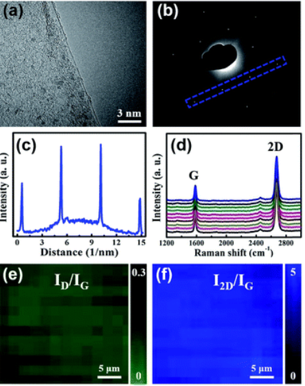 Fig. 3 (a)單晶石墨烯薄膜HRTEM圖。(b)從單晶石墨烯薄膜的隨機區域中保存的圖形。(c)沿b圖中線的衍射點強度。(d)來自10個隨機位置的拉曼光譜和(e,f)單晶石墨烯膜的D/G和2D/G峰強度比的拉曼映射圖。