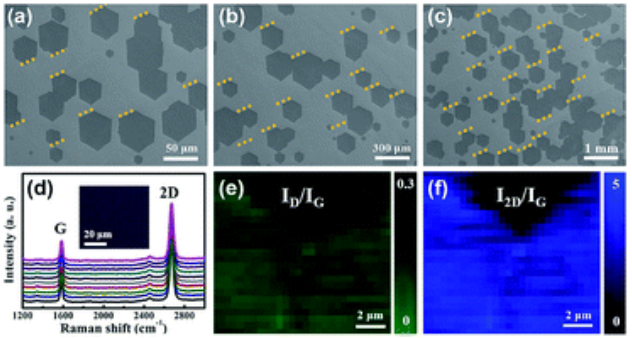 4在不同持續時間下單晶石墨烯生長的SEM圖:(a) 3 min, (b) 5 min和(c) 7 min。(d)來自10個隨機位置的拉曼光譜和(e,f)縫合的單晶石墨烯薄膜的D/G和2D/G峰值強度比的拉曼映射圖像。