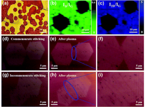 2蝕刻后的單晶石墨烯薄膜的D/G和2D/G峰值強度比的(a)光學圖像和(b,c)對應的拉曼映射圖像。兩個六邊形石墨烯區域的(d-f)相稱拼接和(g-i)不相稱拼接的光學圖像。