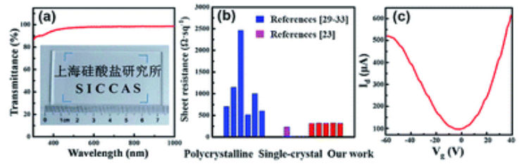 Fig. 6 (a)單晶石墨烯薄膜的透光率。(b)先前和我們的工作中報道的多晶和單晶石墨烯薄膜的薄層電阻比較。(c)單晶石墨烯薄膜載流子遷移率測量結果。