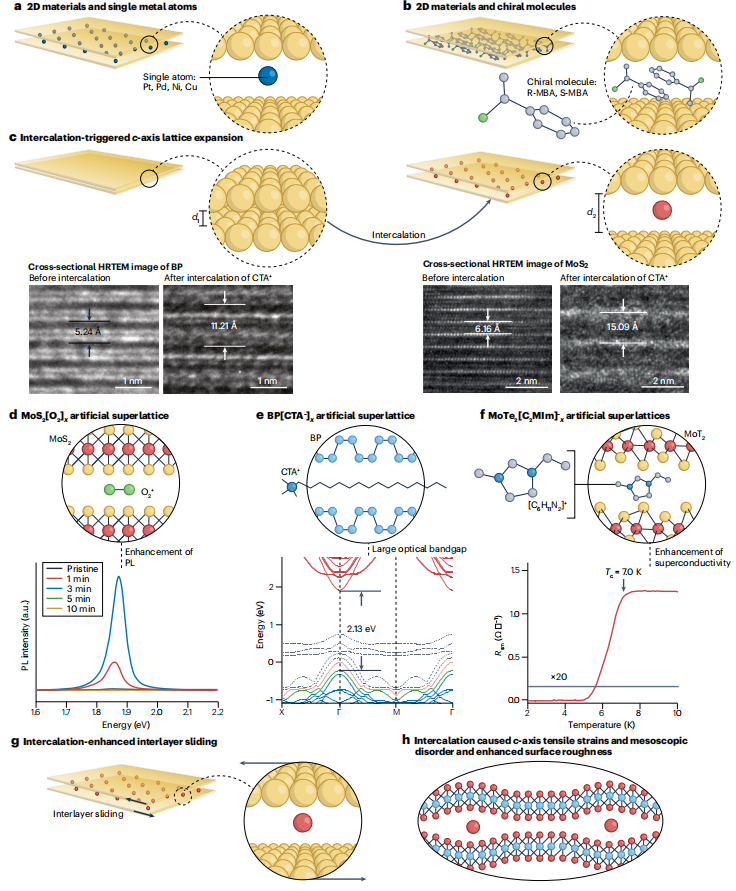 自2000年代初石墨烯發(fā)現(xiàn)后的短短幾年內(nèi),二維材料迅速成為材料研究的熱點(diǎn)領(lǐng)域。這類材料因其各向異性鍵合特性(層內(nèi)強(qiáng)共價(jià)鍵與層間弱范德華力相互作用,見(jiàn)圖1a)而獨(dú)具優(yōu)勢(shì),這種特性使得二維材料中的插層成為可能——經(jīng)插層處理的二維材料也被稱為人工超晶格。插層指將外來(lái)物種(原子、離子或分子)嵌入二維材料的層間范德華間隙(圖1b)或其范德華異質(zhì)結(jié)構(gòu)中(圖1c)。范德華異質(zhì)結(jié)構(gòu)是通過(guò)垂直堆疊不同二維晶體形成的精密結(jié)構(gòu)。