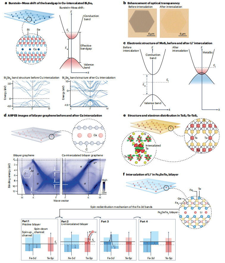 插層會(huì)降低層間粘附力,從而促進(jìn)原子層分離。這使得插層成為制備原子級(jí)薄材料(如二維納米片和一維納米帶,詳見(jiàn)專欄1和2)的有效工具,同時(shí)也是調(diào)控二維材料性能的關(guān)鍵手段。插層能產(chǎn)生層間與客體的協(xié)同效應(yīng),引發(fā)層間相互作用變化,誘導(dǎo)電荷轉(zhuǎn)移(電子或空穴),進(jìn)而改變面內(nèi)鍵合構(gòu)型、費(fèi)米能級(jí)、電子能帶結(jié)構(gòu)和自旋軌道效應(yīng)。這些效應(yīng)可調(diào)控二維材料在光子學(xué)、電子學(xué)、光電、熱電、磁性、催化和能源存儲(chǔ)等領(lǐng)域的性能。