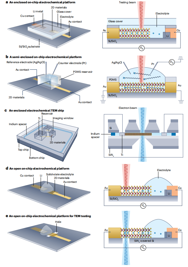f 電化學(xué)插層裝置:基于片上電化學(xué)池體系,目標(biāo)二維材料作為工作電極連接圖案化金屬觸點(diǎn),對(duì)電極及含離子插層劑的電解質(zhì)構(gòu)成回路(UG:電壓)。