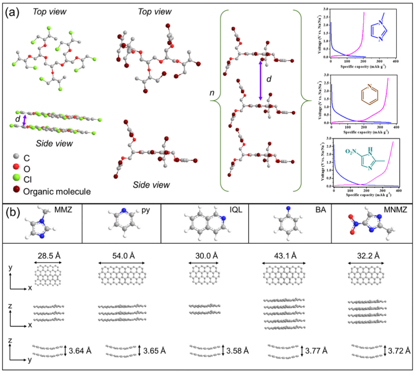 圖2 (a) 不同視角合成的聚合物空間構(gòu)型示意圖及部分碳化硬碳材料的充放電曲線圖;(b) 基于硬碳微晶參數(shù)La(晶粒長度)、Lc(堆疊厚度)和d(層間距)精修所得的結(jié)構(gòu)模型