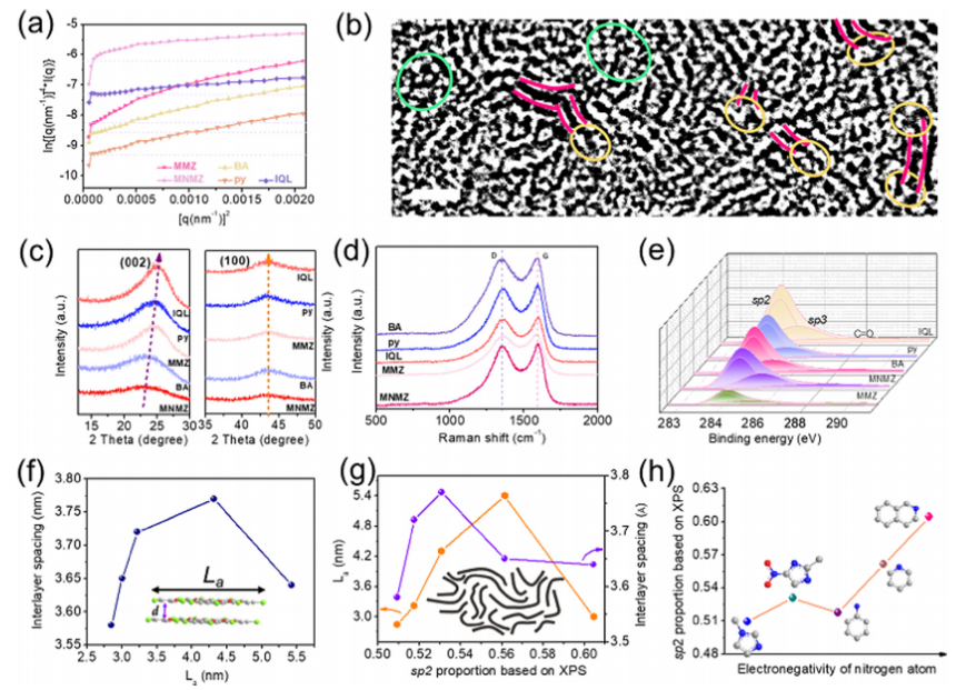 (a) SAXS點(diǎn)準(zhǔn)直模式下的Porod曲線;(b) 彌散區(qū)(紅色標(biāo)注)在短程有序石墨層(黃色)與非晶碳(藍(lán)色)交界處的高分辨TEM圖像(標(biāo)尺:1 nm);(c) XRD譜圖局部放大;(d) 拉曼光譜;(e) C 1s高分辨XPS譜;(f) La與d的關(guān)聯(lián)性;(g) La-d和sp²雜化比例關(guān)系;(h) 氮原子電負(fù)性與sp²比例相關(guān)性