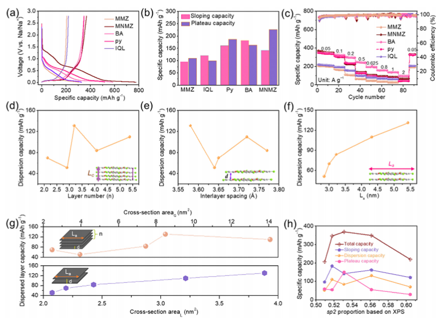 圖4 (a) 充放電曲線對比;(b) 平臺容量與斜坡容量分布;(c) 倍率性能測試(50–2000 mA g?¹);彌散區(qū)容量與(d)石墨層數(shù)、(e)層間距d、(f)微晶尺寸La的關(guān)聯(lián)性;(g) SL/SG(斜坡/平臺容量比)與彌散區(qū)容量的關(guān)系;(h) sp²雜化比例與容量的相關(guān)性