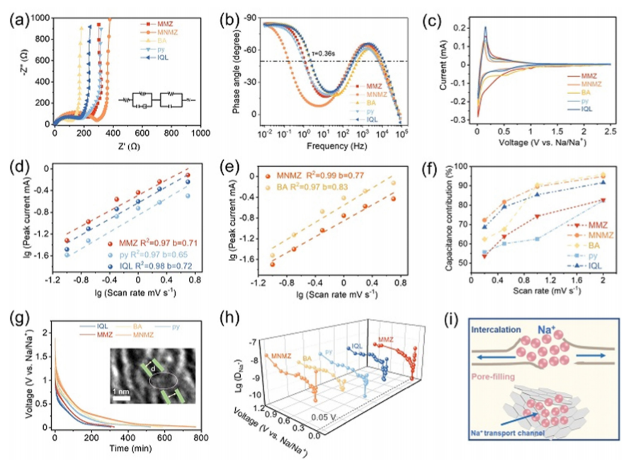(a) 奈奎斯特曲線(插圖:等效電路圖);(b) 伯德圖;(c) 所有樣品在0.2 mV s?¹下的CV曲線;(d,e) 特定峰電流下的log(i)-log(v)關(guān)系;(f) 0.2-2 mV s?¹掃速下電容貢獻(xiàn)占比;(g) GITT曲線(插圖:高分辨TEM);(h) 第二周嵌鈉過程的表觀鈉離子擴(kuò)散系數(shù);(i) 鈉離子后續(xù)遷移路徑示意圖