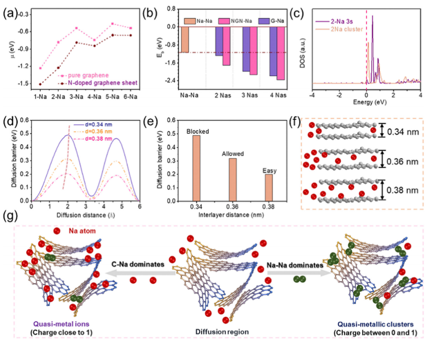 (a) 鈉原子吸附能;(b) 石墨烯納米片上的G-Na、NGN-Na及Na-Na相互作用(G、NGN、Na分別代表碳原子、氮摻雜碳原子和鈉原子);(c) NGN上2Na與2Nas的態(tài)密度(DOS)——2Na指兩個孤立鈉原子,2Nas指形成的二聚鈉簇;費(fèi)米能級設(shè)為零點(diǎn);(d,e) 鈉離子在不同擴(kuò)散區(qū)間的遷移速率;(f) Na?在硬碳(HC)中擴(kuò)散行為的計(jì)算模型;(g) Na-Na、G-Na和NGN-Na相互作用決定擴(kuò)散區(qū)鈉存儲狀態(tài)的示意圖(鈉原子和二聚鈉簇分別用紅球和綠球表示)