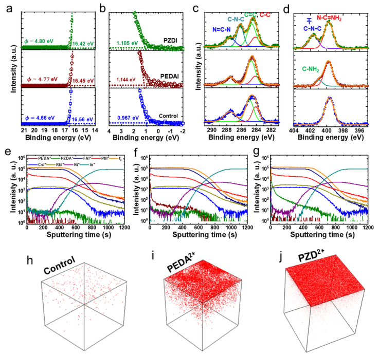· C 1s譜:284.4 eV(C-C/C=C)、286.2 eV(C-N-C)、287.4 eV(N=C-N)特征峰,PZDI處理的薄膜中C-N-C峰顯著增強,表明其與鈣鈦礦表面的強相互作用。