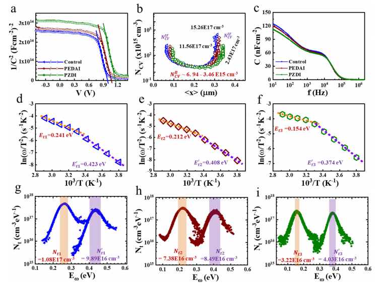· 通過溫度依賴性分析缺陷態(tài)能級(Et),PZDI處理使缺陷態(tài)更淺(Et3~0.154 eV),優(yōu)于PEDAI(Et2~0.212 eV)。
