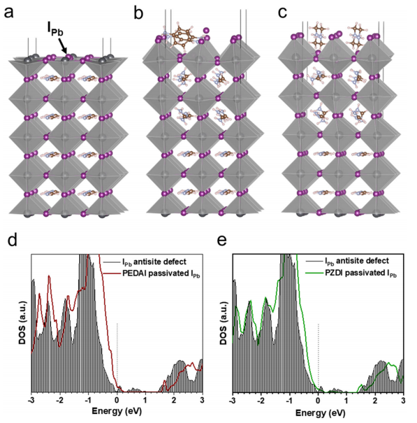 *PZDI鈍化(圖e):缺陷態(tài)峰完全消失,費米能級處態(tài)密度趨近于零,證實其高效鈍化效果。