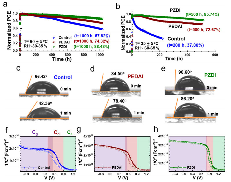 圖6 | 鈣鈦礦太陽能電池的工況穩(wěn)定性、薄膜疏水性及器件電容響應(yīng)