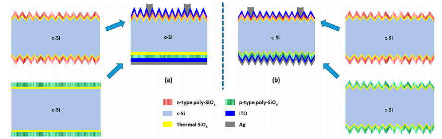 圖1. (a)單面織構(gòu)(SST)多晶硅氧(poly-SiOx)鈍化晶體硅(c-Si)太陽(yáng)能電池,其頂部采用雙面織構(gòu)(DST)基板并對(duì)稱(chēng)摻雜n型多晶硅氧,底部采用雙面拋光(DSP)基板并對(duì)稱(chēng)摻雜p型多晶硅氧;(b)雙面織構(gòu)多晶硅氧鈍化c-Si太陽(yáng)能電池,頂部和底部均采用DST基板,并分別對(duì)稱(chēng)摻雜n型和p型多晶硅氧。“TO”指氧化銦錫。轉(zhuǎn)載自參考文獻(xiàn)[10](版權(quán)2023年,《光伏研究與應(yīng)用進(jìn)展》),已獲許可。
