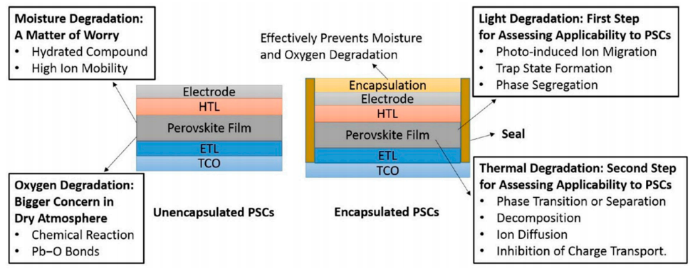 · 氧侵蝕:氧氣與鈣鈦礦界面反應(yīng)生成超氧化物(如O??),破壞電荷傳輸層結(jié)構(gòu)。