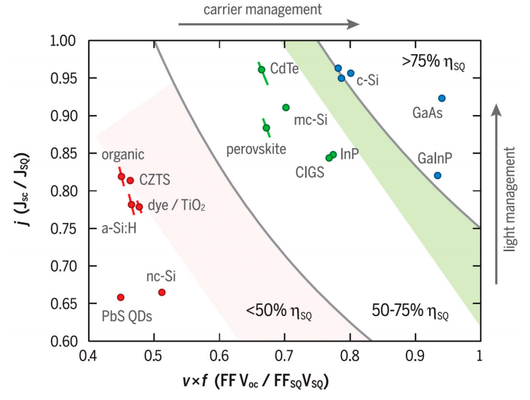 圖12. 不同光伏材料達(dá)到S-Q理論極限(電壓與電流)的占比。圖中頂部和右側(cè)坐標(biāo)軸箭頭分別代表通過(guò)優(yōu)化光管理及增強(qiáng)載流子收集對(duì)電池效率的提升。"nso"指代依據(jù)S-Q模型可實(shí)現(xiàn)的最高效率。轉(zhuǎn)載自參考文獻(xiàn)(版權(quán)2016年,《Science》),已獲許可。