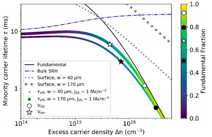圖2. 采用厚度為170 μm和40 μm的n型晶圓結(jié)構(gòu)的有效少數(shù)載流子壽命模型。這些晶圓具有以下特性:體相肖克利-讀-霍爾(SRH)壽命為10 ms,體電阻率為3.55 Ω·cm(對(duì)應(yīng)摻雜濃度為1.3×10¹? cm?³),雙表面復(fù)合速度(J??)總和為1 fA/cm²。圖中通過(guò)不同曲線(xiàn)區(qū)分復(fù)合機(jī)制,并附有色條標(biāo)注本征復(fù)合(包括俄歇和輻射過(guò)程)占比。黑色星號(hào)表示短路電壓下的最大電壓,黑色圓圈表示短路功率電壓。晶片的產(chǎn)生電流根據(jù)各自厚度的適當(dāng)Lambertian光捕獲極限確定。此外,色條中的標(biāo)記突出顯示了最大功率點(diǎn)和開(kāi)路注入時(shí)的本征復(fù)合比例。轉(zhuǎn)載自參考文獻(xiàn)[15](版權(quán)2020年,《材料化學(xué)A期刊》),已獲許可。