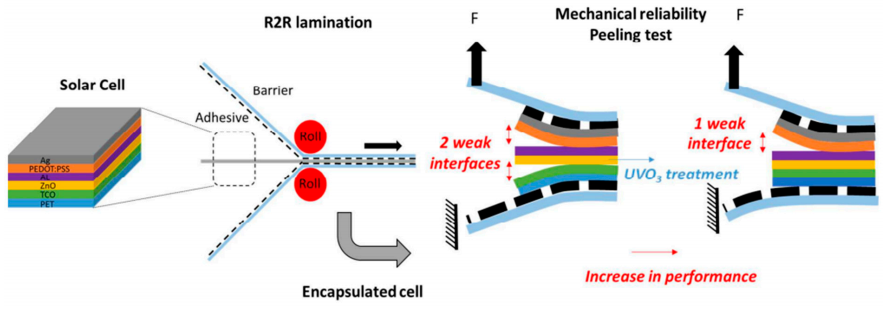 圖4. 提升有機(jī)光伏器件耐久性與性能的工藝流程示意圖。圖中展示了一個(gè)通過(guò)卷對(duì)卷(R2R)層壓封裝的多層太陽(yáng)能電池結(jié)構(gòu),并標(biāo)出兩個(gè)易發(fā)生分離的薄弱界面。通過(guò)機(jī)械剝離測(cè)試評(píng)估其機(jī)械可靠性后,對(duì)其中一個(gè)界面進(jìn)行紫外-臭氧(UVO?)處理,從而改善粘附性、減少薄弱界面至一個(gè),最終實(shí)現(xiàn)電池整體性能的提升。轉(zhuǎn)載自參考文獻(xiàn)(版權(quán)2018年,《ACS應(yīng)用材料與界面》),已獲許可。