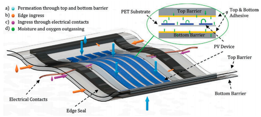 圖5. 示意圖展示了水分和氧氣通過(guò)四種不同途徑滲透柔性封裝鈣鈦礦太陽(yáng)能電池(PSC)與有機(jī)光伏(OPV)器件的路徑,導(dǎo)致器件加速降解并縮短使用壽命。具體包括:(a)頂/底部屏障滲透(淺藍(lán)色箭頭與液滴表示);(b)邊緣侵入(淺棕色液滴與箭頭表示);(c)電接觸位點(diǎn)侵入(紫色液滴與箭頭表示);(d)水分與氧氣脫氣(綠色液滴與箭頭表示)。轉(zhuǎn)載自參考文獻(xiàn)(版權(quán)2021年,《先進(jìn)能源材料》),已獲許可。