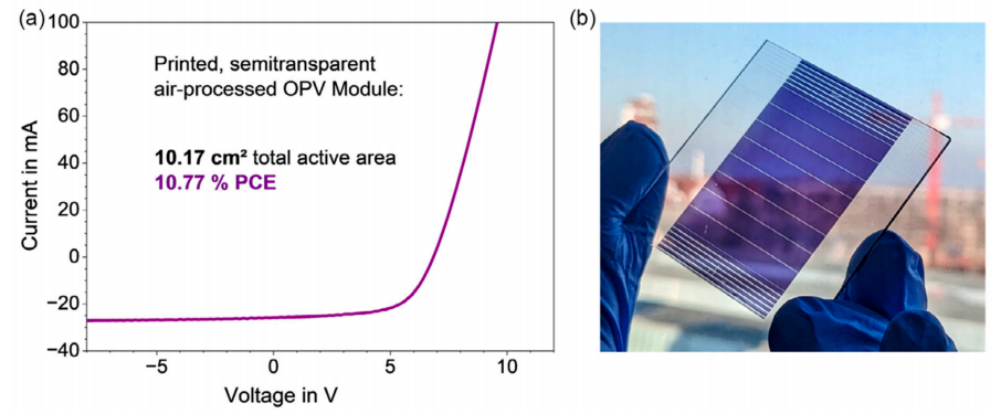 圖6. 圖像展示了:(a)溶液法和空氣環(huán)境全流程制備的半透明組件的電流-電壓(j-V)曲線(xiàn);(b)該組件的實(shí)物照片。該模塊以玻璃/ITO為基底,由8個(gè)串聯(lián)電池組成,總有效面積為10.17 cm²,并包含背反射層結(jié)構(gòu)。轉(zhuǎn)載自參考文獻(xiàn)(版權(quán)2023年,《Solar RRL》),已獲許可。
