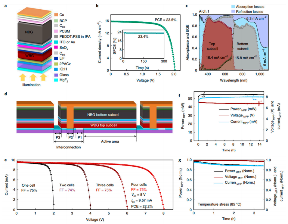 圖7. 詳細(xì)闡述了基于鈣鈦礦的疊層太陽(yáng)能電池與組件的研發(fā)及性能表現(xiàn)。(a)展示了疊層電池的結(jié)構(gòu)設(shè)計(jì)與組成,突出使用了濺射氧化銦錫層(約15納米厚)和薄金膜(1-2納米厚)作為復(fù)合層,其中“NBG”和“WBG”分別代表窄帶隙和寬帶隙。(b)展示了高性能疊層器件在最大功率點(diǎn)下的電流-電壓(J-V)特性及持續(xù)五分鐘的功率轉(zhuǎn)換效率(見(jiàn)插圖)。(c)分析了上下子電池的外部量子效率(EQE)及其疊加效果(灰線(xiàn)表示),同時(shí)計(jì)算了整體吸收(1-反射率,黑線(xiàn)表示),并解釋了淺藍(lán)與深藍(lán)區(qū)域分別代表的寄生吸收和反射損耗對(duì)電流密度的影響。(d)以示意圖形式展示了互連的雙終端全鈣鈦礦疊層太陽(yáng)能模塊(未按比例繪制),標(biāo)注了有效區(qū)域和劃線(xiàn)區(qū)域,模塊各層顏色與疊層電池保持一致。I描述了模塊內(nèi)單個(gè)疊層電池帶的J-V特性,包括填充因子及逐步納入分析時(shí)的變化。(f)詳細(xì)記錄了在連續(xù)AM 1.5G光照下模塊最大功率點(diǎn)的功率、電壓和電流。(g)展示了在氮?dú)猸h(huán)境中85℃溫度應(yīng)力下,最大功率點(diǎn)的功率、電壓和電流的歸一化表現(xiàn)。前三個(gè)部分(a-c)針對(duì)疊層電池,后四部分(d-g)則聚焦于疊層模塊。轉(zhuǎn)載自參考文獻(xiàn)(版權(quán)2020年),已獲許可。