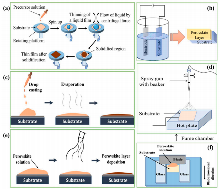 圖8. 溶液法制備鈣鈦礦太陽(yáng)能電池(PSCs)的工藝方法包括:(a)旋涂技術(shù),(b)電化學(xué)沉積法,(c)滴鑄法,(d)噴涂工藝,(e)吹干法,以及(f)刮涂技術(shù)。轉(zhuǎn)載自參考文獻(xiàn)(版權(quán)2022年,《RSC Advance》),已獲許可。