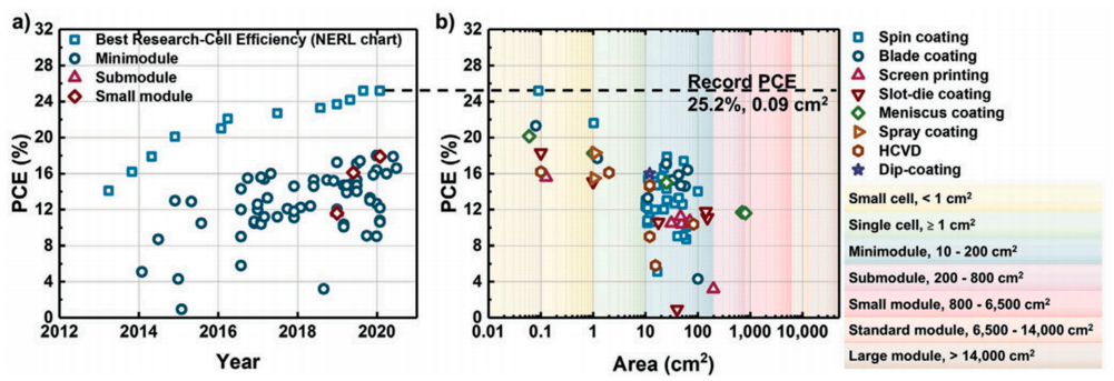 圖9. (a,b)鈣鈦礦太陽(yáng)能電池的發(fā)展趨勢(shì):(a)展示了不同尺寸電池的功率轉(zhuǎn)換效率(PCE)隨年份的變化;(b)呈現(xiàn)了不同制備方法下PCE與電池尺寸的關(guān)系。轉(zhuǎn)載自參考文獻(xiàn)(版權(quán)2020年,《Advanced Materials》),已獲許可。