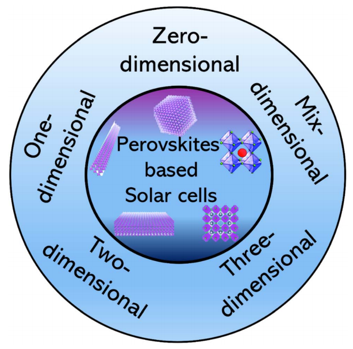 圖1. 本綜述文章概述了鈣鈦礦太陽能電池(PSCs)中的維度多樣性(0D、1D、2D和3D)及其混合維度集成的潛力。