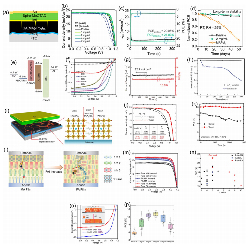 圖4 (a) 基于準(zhǔn)二維ACI GA(MA)nPbnI3n+1(n = 5)的PSC器件結(jié)構(gòu)。(b) 經(jīng)過和未經(jīng)過(原始)ImI處理的PSC在正向和反向掃描下的J-V曲線。(c) 在最大功率點(diǎn)(MPP)下,以0.948 V的偏置電壓測量PSC的穩(wěn)定功率輸出。未經(jīng)處理(原始)和處理后的樣品均含有2 mg mL−1的ImI。(d) 經(jīng)過和未經(jīng)過2 mg mL−1 ImI處理的PSC以及基于MAPbI3的PSC的穩(wěn)定性。(a)-(d) 已獲許可重印。68 版權(quán)所有 2022, ACS。(e) PVSC器件能帶對齊圖,(f) 不同NH4SCN濃度下器件的J-V曲線,(g) PSC的光電流,(h) 基于(PEA)2(MA)4Pb5I16(n = 5)鈣鈦礦薄膜的PSC器件在氮?dú)馐痔紫浜?5%濕度環(huán)境下的穩(wěn)定性測試。(e)-(h) 已獲許可重印。69 版權(quán)所有 2018, Wiley。(i) 使用多晶3D鈣鈦礦薄膜并在晶界處含有2D鈣鈦礦的器件示意圖…(內(nèi)容省略)…目標(biāo)器件與對照器件的PCE比較。器件保存在黑暗且濕度可控的環(huán)境中。(i)-(k) 已獲許可重印。148 版權(quán)所有 2018, Nature。(l) 基于MA和FA的2D鈣鈦礦在斜向和分級垂直排列中的晶體取向和相分布示意圖。(m) 最佳純MA、FA/MA和純FA器件在正向和反向掃描下的J-V曲線。(n) 高效低維鈣鈦礦太陽能電池PCE總結(jié)。(l)-(n) 已獲許可重印。70 版權(quán)所有 2022, Wiley。(o) 0和6 mol% MACl摻雜的PSC冠軍器件的J-V曲線。插圖展示了MACl摻雜如何改變堆疊的鈣鈦礦薄膜。已獲許可重印。149 版權(quán)所有 2020, ACS。(p) 不含spiro-OMeTAD的PSC的PCE統(tǒng)計數(shù)據(jù),根據(jù)M2P前驅(qū)體溶液的不同條件分類。已獲許可重印。150 版權(quán)所有 2020, Wiley。