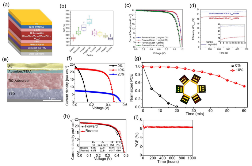 圖5 (a) 展示了雙面鈍化PSC中各層順序的示意圖。(b) 展示了控制PSC和鈍化PSC的PCE(光電轉(zhuǎn)換效率)光伏參數(shù)波動圖。(c) 展示了性能最優(yōu)的控制PSC和雙面鈍化PSC的J-V(電流密度-電壓)曲線。(d) 展示了在最大功率點(diǎn)(MPP)穩(wěn)定后的PSC效率(插圖展示了最初40秒的穩(wěn)定過程,顯示了控制電池和鈍化電池之間的瞬態(tài)響應(yīng)差異)。(a)-(d) 已獲授權(quán)重印。版權(quán)所有 2020,ACS(美國化學(xué)學(xué)會)。(e) 展示了器件的橫截面SEM(掃描電子顯微鏡)圖像。(f) 展示了在太陽能電池中使用的不同添加量的鈣鈦礦吸收層的J-V曲線。(g) 測試了有無10% en-FASnI3負(fù)載的太陽能電池在AM1.5 G(全球大氣質(zhì)量1.5)連續(xù)光照下的老化能力。(h) 展示了在正向和反向電壓掃描下測量的含有10% en-FASnI3鈣鈦礦吸收層的最佳PSC的J-V曲線。(i) 展示了10%封裝器件隨存儲時間的效率變化。(e)-(i) 已獲授權(quán)重印。版權(quán)所有 2017,Science(科學(xué)雜志)。
