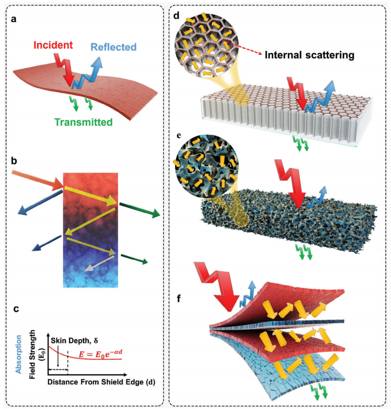 圖1. a,b) 高度導電薄結構中主要電磁干擾(EMI)屏蔽機制的示意圖。c) 趨膚深度是指電磁場強度呈指數級衰減至初始入射值1/e的距離。d) 分隔結構、e) 多孔結構和f) 多層結構內部散射的示意圖。