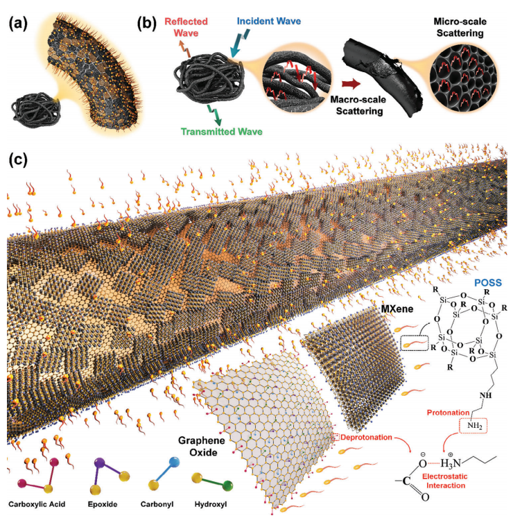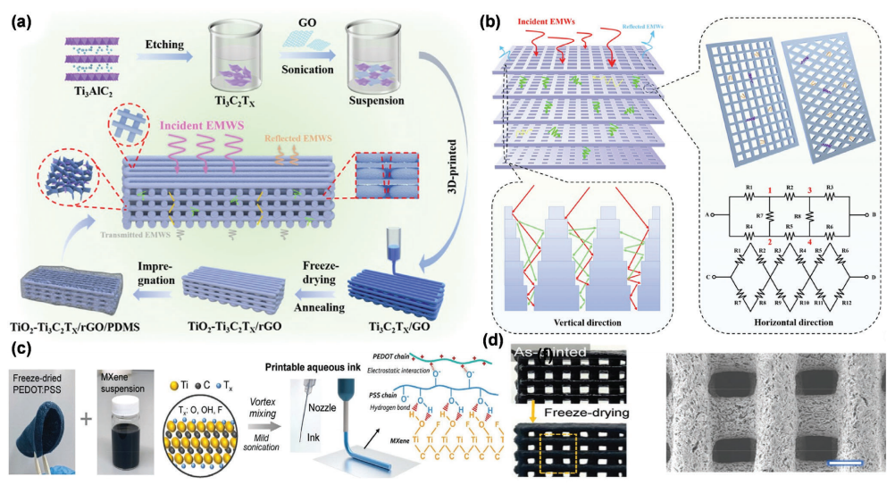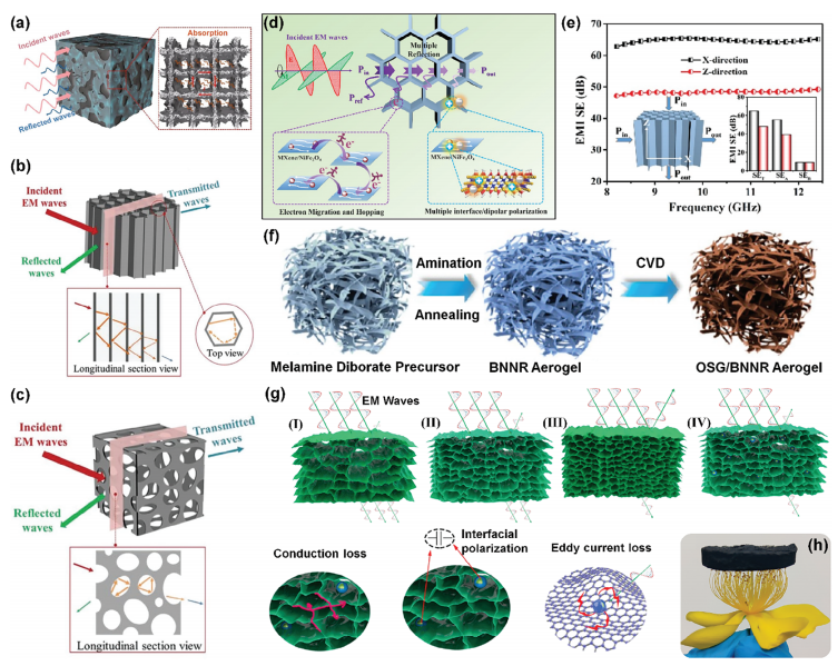 設計吸收主導型EMI屏蔽結構需要特別注意詳細的結構設計,旨在最小化反射不必要的電磁噪聲,并通過各種衰減機制捕獲電磁 波。這種解決方案通常被稱為“EMI陷阱”或綠色EMI屏蔽。然而,過分強調材料選擇而忽視屏蔽行為的重要性,導致許多反射主導型EMI屏蔽的產生。以MXene為例,這種二維納米材料因其高導電性而被廣泛用于薄膜制備,但主要反射入射電磁波,類似于傳統金屬基EMI屏蔽材料。然而,通過巧妙的結構設計和MXene與其他低導電介質的集成,如氣凝膠、泡沫或多層復合材料,可以充分挖掘其用于先進低反射屏蔽解決方案的潛力。這一示例為EMI屏蔽指明了一條 道路:必須將電磁屏蔽材料的內在特性與合理的結構設計相結合,以實現吸收主導型屏蔽。這一關鍵概念在本領域內的實驗和綜述文獻中尚未得到充分探討。