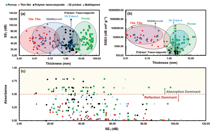 完整數據集及屏蔽系統參數詳見支持信息中的表S2。注:本圖表中所有EMI屏蔽數據的工作頻率范圍均位于X波段(8.2–12.4 GHz)。