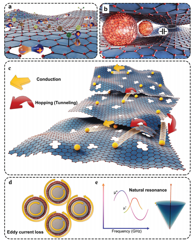 b) 界面極化的簡化示意圖,展示了由石墨烯和磁性納米顆粒組成的納米復合材料,其中導電相與磁性相之間具有大量界面。