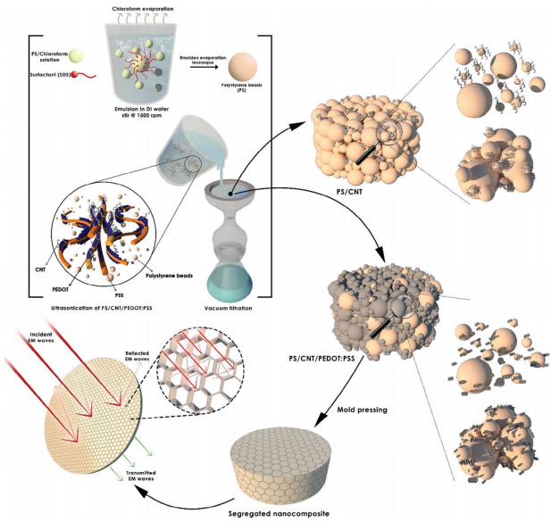 2、結構功能化:PS微球的規則多孔結構可增加電磁波內反射路徑,與CNT、PEDOT:PSS的界面極化結合,協同增強吸收損耗。