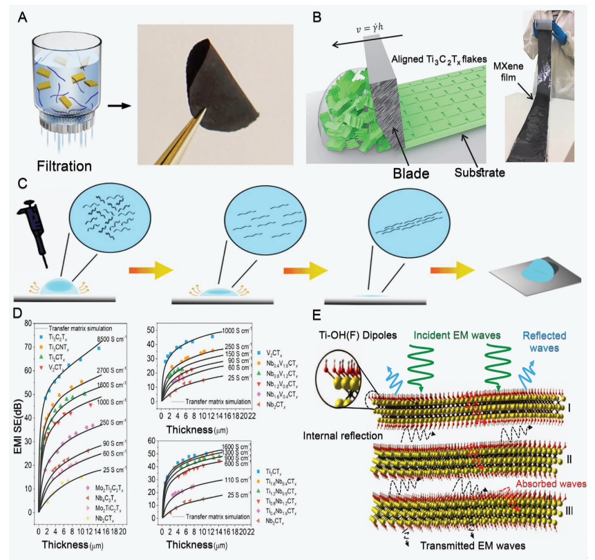 性能可調性:MXene的化學組分(M2XTx vs M4X3Tx)和厚度可顯著調控屏蔽效能。