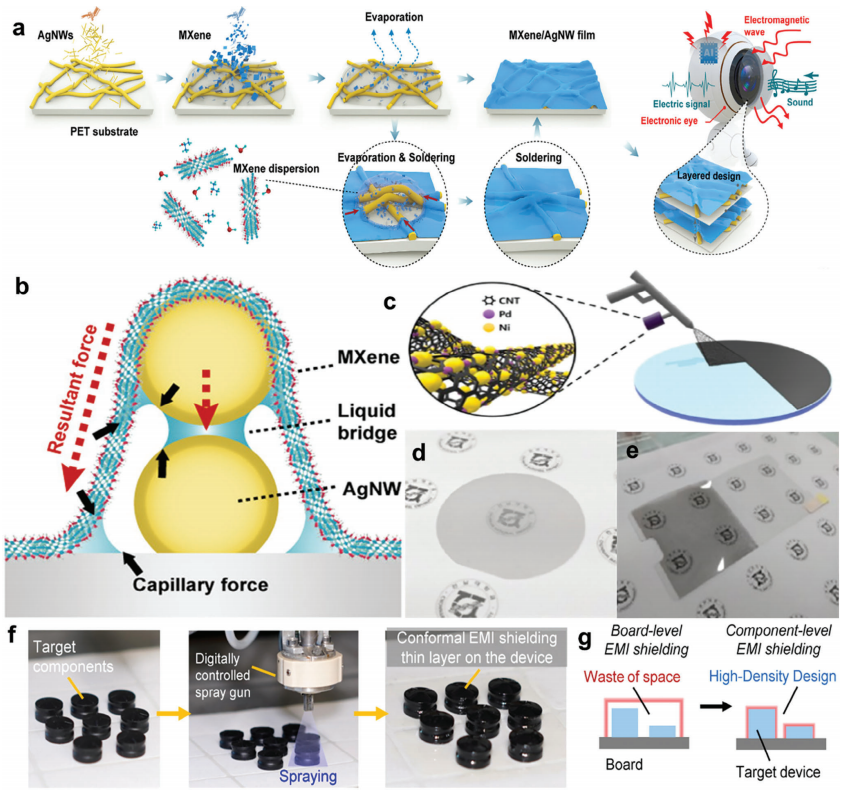 f) 通過噴涂工藝實現元件級共形電磁屏蔽(EMI)解決方案的流程示意圖。